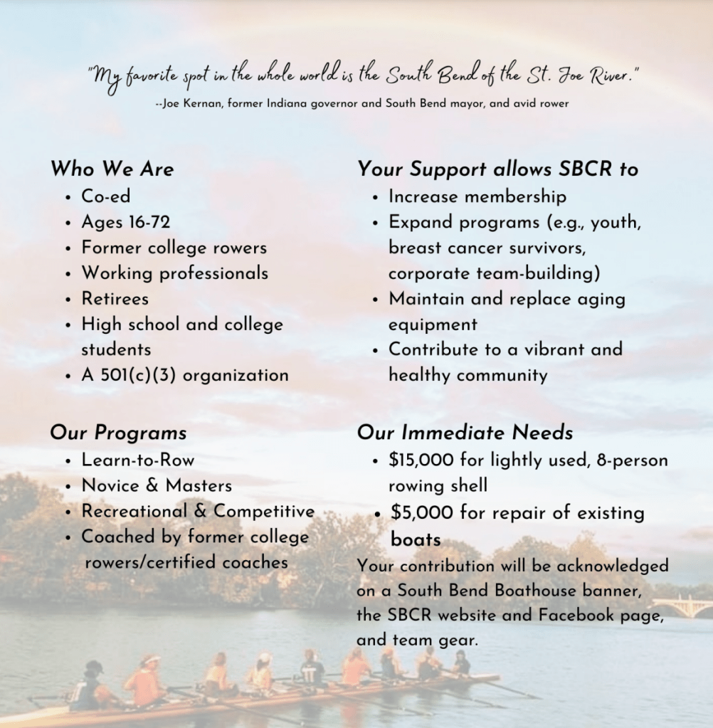 South Bend Community Rowing is a 501(c)(3) nonprofit organization located in South Bend, Indiana, on the beautiful St. Joseph River. Founded in 2017, the organization offers several programs, including coxswain development, learn-to-row, return-to-row, masters rowing, and novice rowing, plus conditioning programs during the winter months. Future plans include additional community programs such as recovery on water rows for cancer survivors and veterans rowing.